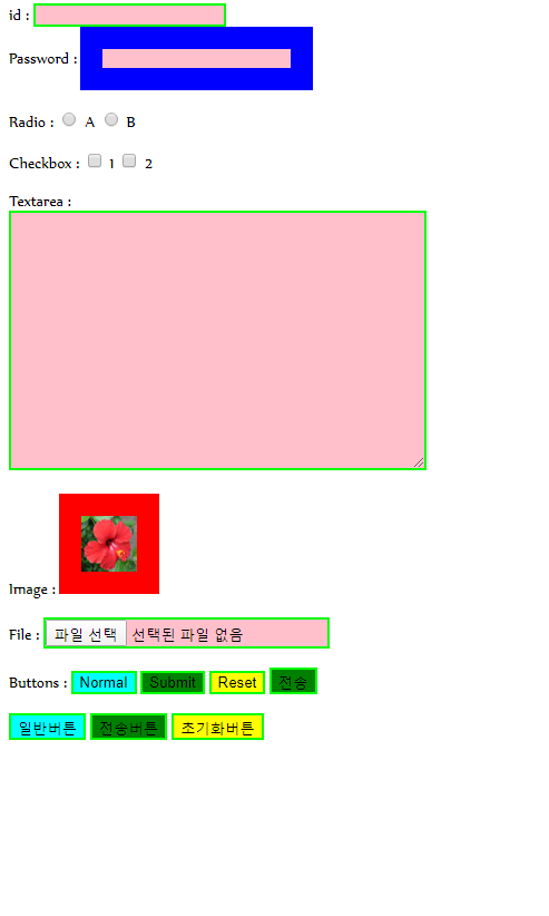 - input요소에 테두리 2px 라임색, 배경색 핑크색 주기