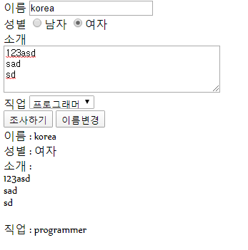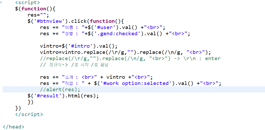 res += "소개 : <br>" + vintro + "<br>"; --> id intro의 값을 받아옴
