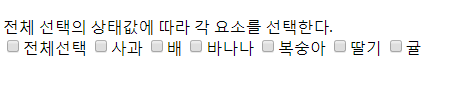$('#all')/change(function(){ --> 전체선택 클릭 시 나머지 과일에 체크됨