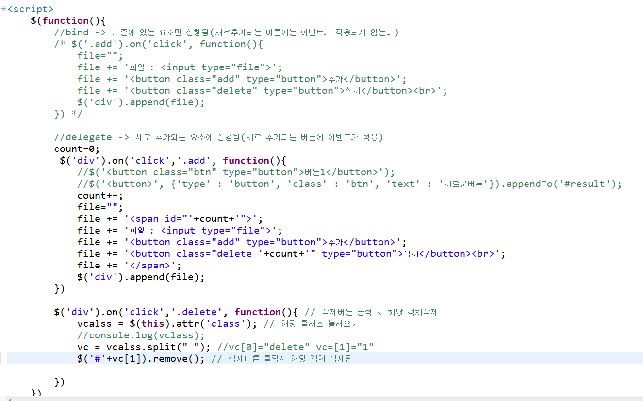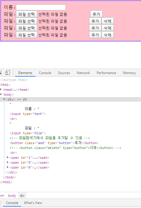 file += '<button class="delete ' + count + '"type="button"">삭제</button><br>'; --> span태그 안에 삭제버튼 만들기