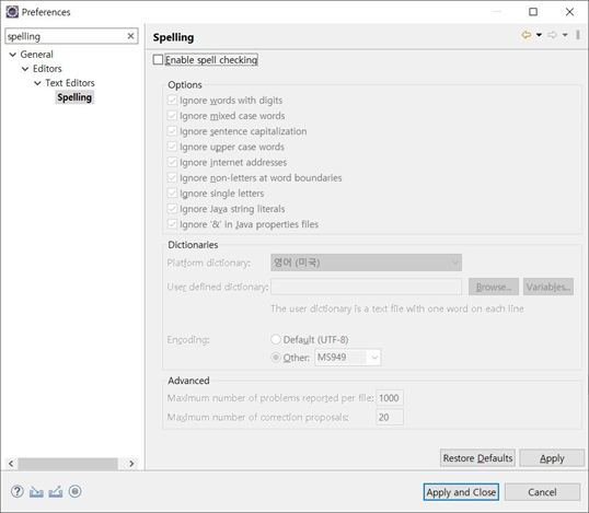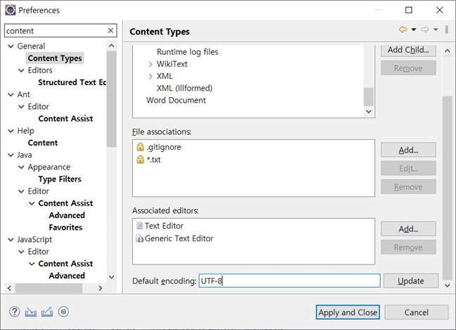 Default encoding 부분에 UTF-8을 입력해 주면 된다. 입력 하고 난 후 Update 버튼을 누르면 된다.