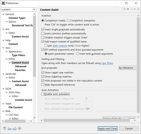 이클립스에서 자동추천기능을 해제시켜 준다.